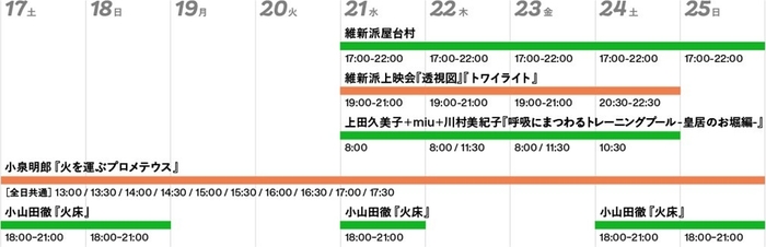 ダムタイプ※初期メンバーで、人が集まる場のあり方の模索と実践を重ねてきたアーティストの小山田徹氏は、最も原始的な光の一つのかたちである「火」で、コミュニケーションの場をつくり上げる。小山田氏が各地で展開しているプロジェクトで、公募で集めた「火守り」と来園者が焚き火を囲んで語らいの場を創出する。会期中には多彩なゲストを招きトークイベント等も実施し、共有の場としての公園の可能性を考える予定。詳細は特設サイトを参照。