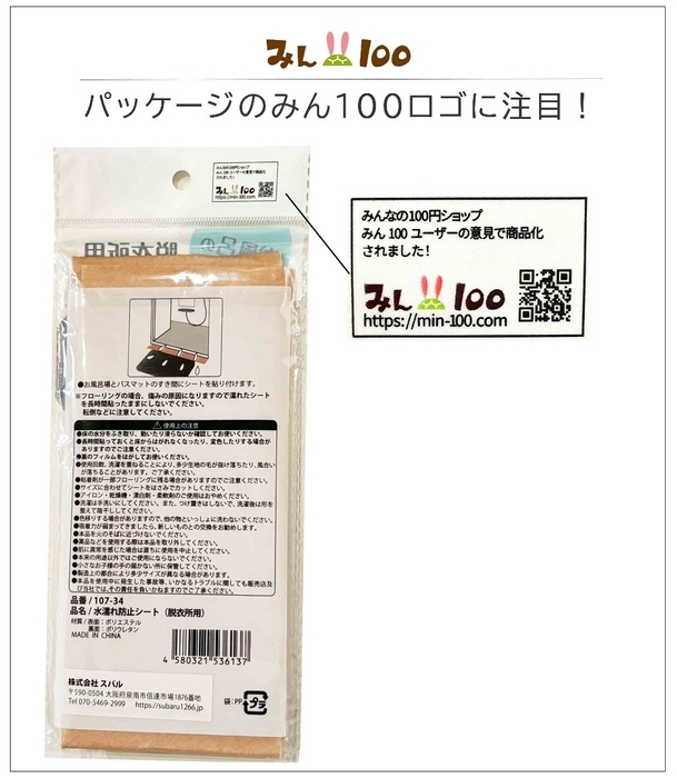 当社が運営する商品共創サービス「みん100」は、消費者の声をもとにメーカー様と共に商品開発をし、全国の100円ショップ店頭で展開しています。今回発売される「水濡れ防止シート」も、消費者の悩みに寄り添い、複数回にわたるユーザーアンケートを通じて形になった商品です。水回りの小さな不便に寄り添った本商品は、浴室前の水漏れ対策をより簡単に、より衛生的にするアイテムとして、幅広いご家庭に活用いただけます。また商品パッケージには共創の印が印字されています。