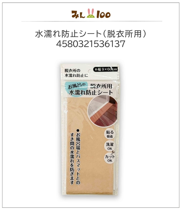 みん100株式会社(本社:京都府京都市、代表取締役:池田 大介)は、「入浴後に浴室前へ水が垂れることで床が濡れたり、バスマット周りの掃除が増えたりする」という消費者さまから頂いた課題をベースに新商品「水濡れ防止シート(脱衣所用)」を株式会社スバルと共同開発し全国の100円ショップにて販売開始いたしました。本商品は、浴室入口とバスマットのすき間に設置することで水滴の広がりを防止し、脱衣所の床を快適に保つことを目的に開発されたものです。