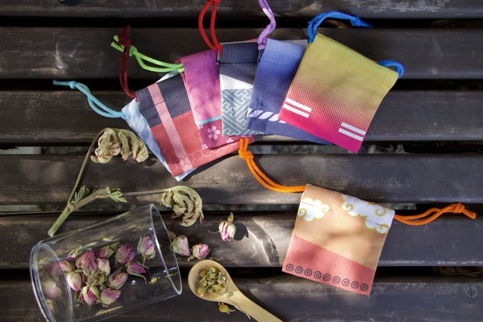 今回のイベントでは、全8種の限定デザインの香り袋から1つをお選びいただき、10種類以上の香料から自分の好みに合わせて調合し、世界でひとつだけの香り袋(サシェ)をつくることができます。香料には、ラベンダーやマリーゴールドなどのドライフラワーを原料とし、“花の島”とも呼ばれる淡路島で獲れたお花も活用。