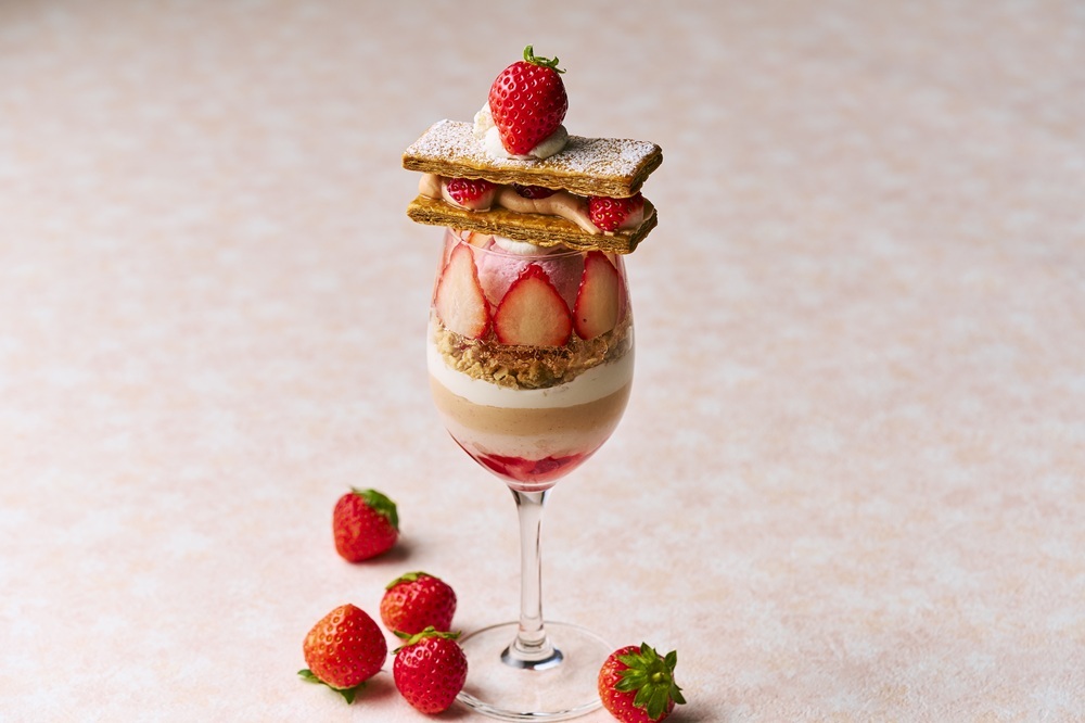 苺ミルフィーユから楽しむ、華やかな一品。ピンクと白を基調とした層に、ナッツやクランブル、フィアンティーヌの食感が重なり、食べ進めるほどに苺の魅力が広がります。
