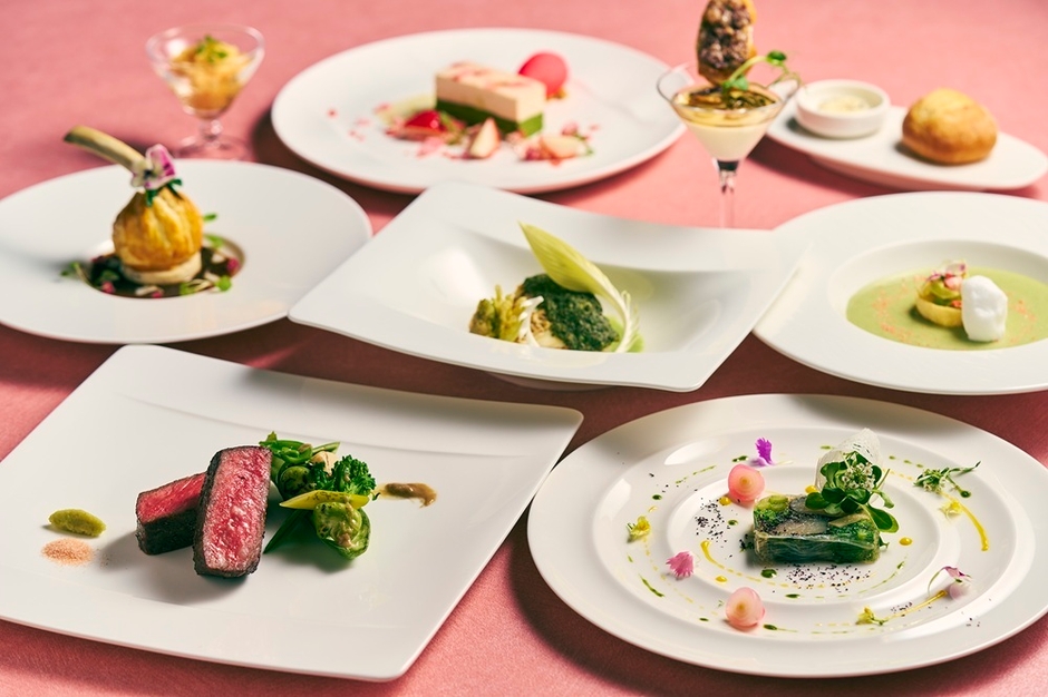 季節の食材を活かしたコース料理を気軽に楽しめる「Saison(セゾン)」と、より華やかで充実したラインアップの「LIBER(リーベル)」の2種をご用意しております。彩り鮮やかで春の始まりを感じさせる前菜「春野菜と紫蘇香るホタテ貝柱のゼリー寄せ 菜園風」や「春キャベツと新じゃがのポタージュ 桜エビのパニプリを浮かべて」、石窯でじっくりと焼き上げた桜鯛を使用した「桜鯛の石窯焼き 緑茶のブールブラン ふきのとうのバターを纏わせて」など旬の素材を贅沢に使用。メインディッシュの「炭火焼ステーキ」は、噛むほど脂があふれてとろける肉質が魅力。春の香りが漂う至福のフレンチジャポネを心ゆくまでご堪能ください。