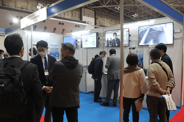 会場一角の理大などのブースでは、2基の画面で好適環境水®による養殖実績と、国内で初めて成功したベニザケ養殖ビデオを放映。いちいは福島市の養殖水槽の様子をライブ放映しました。水産業者や取り扱い業者、養殖事業を検討する企業関係者が訪れ、山本俊政工学部応用化学科准教授らが事業や好適環境水®について説明しました。