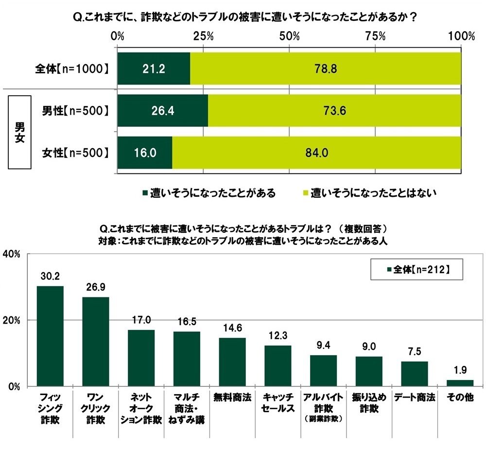 また、全回答者(1,000名)に、これまでに、詐欺などのトラブルの被害に遭いそうになったことがあるか聞いたところ、「遭いそうになったことがある」は21.2%、「遭いそうになったことはない」は78.8%となりました。