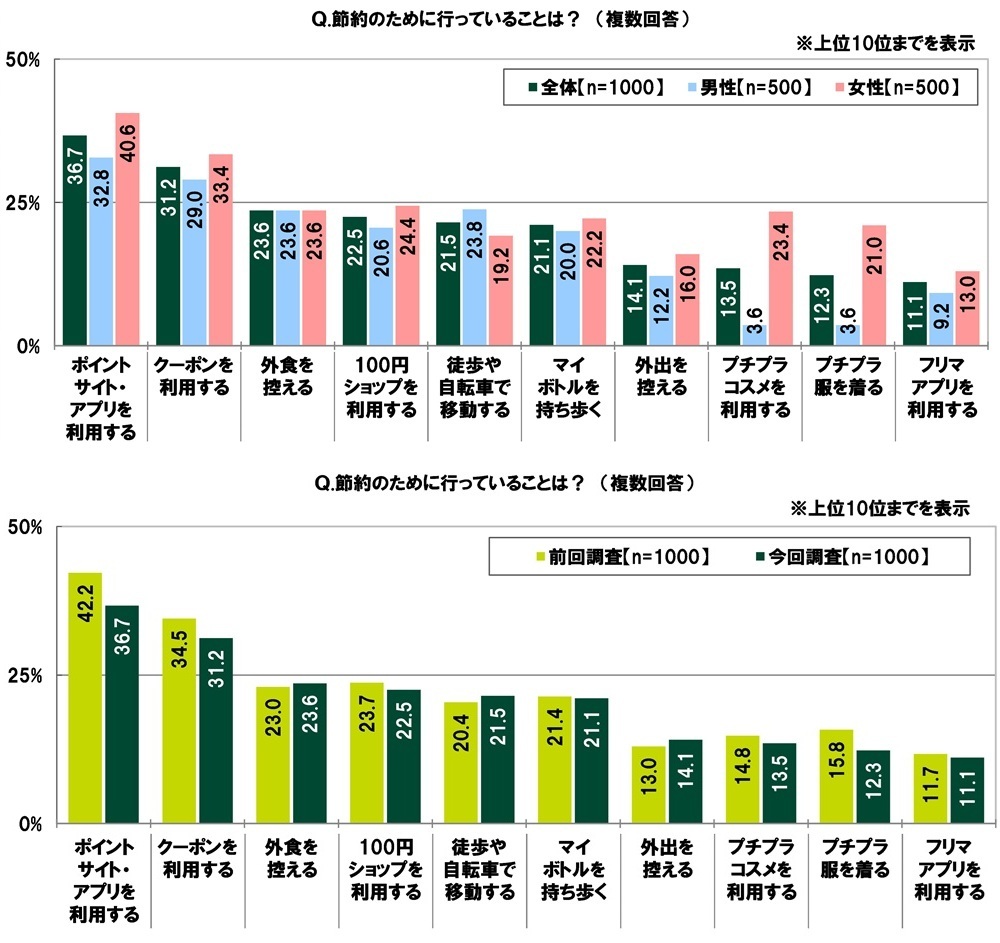 男女別にみると、男性・女性ともに1位は「ポイントサイト・アプリを利用する」(男性32.8%、女性40.6%)、2位は「クーポンを利用する」(男性29.0%、女性33.4%)となり、男性では「徒歩や自転車で移動する」(23.8%)が3位、女性では「100円ショップを利用する」(24.4%)が3位でした。