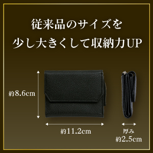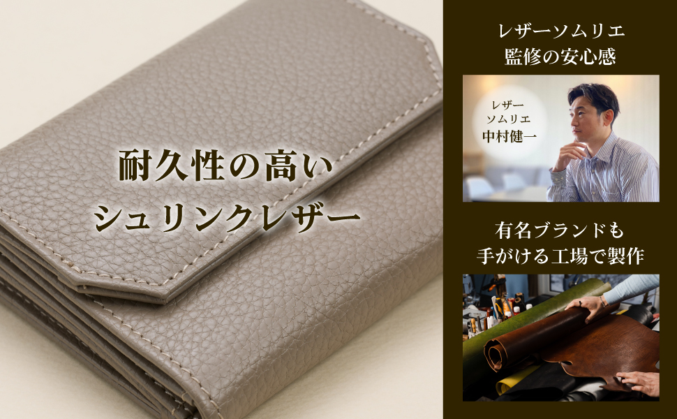 一般社団法人日本皮革産業連合会認定のレザーソムリエ中村 健一が監修し、有名ブランドも手がける工場で生産。しっとり柔らかな質感の牛革シュリンクレザーで出来ていて、傷がつきづらく、長くご愛用いただけます。コンパクトさを保ちつつも収納力を高めるために、当社従来品から幅約1cm、高さ約0.6cm広げました。