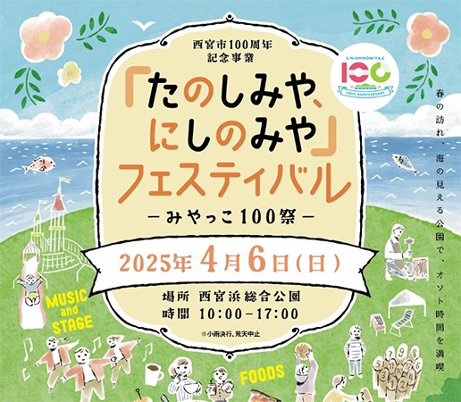 阪神園芸株式会社(本社:兵庫県西宮市、社長:久保田晃司)は、西宮市市制100周年を記念し、2025年4月6日(日)に、当社が指定管理者として管理運営を行う西宮浜総合公園(兵庫県西宮市西宮浜3丁目)『「たのしみや、にしのみや」フェスティバル-みやっこ100祭-』を開催します。本催しは、西宮市をはじめ、市内や公園周辺の企業・団体(古野電気株式会社、西宮阪急、にしのみや若者応援BANK、(公財)西宮市文化振興財団、無印良品 阪急西宮ガーデンズ、兵庫県・公益財団法人兵庫県スポーツ協会・兵庫県立海洋体育館、有限会社コモンズ(順不同))の共催のもと、西宮の魅力を再発見していただこうとするものです。