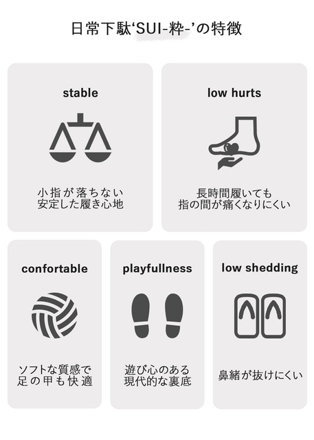 「SUI-粋-」は、その固定概念から脱し、鼻緒の位置を中央よりずらして設計(親指と人差し指の間)したことにより、小指が落ちることなく、安定感ある履き心地を実現いたしました。