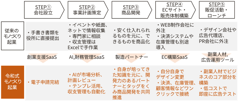 従来、創業の各プロセスにおいて手続きはオフライン中心で、ビジネス設計においては専門家やパートナー企業への依存度が高くハードルが高いと思っていましたが、悩んでいた時にAIの普及や副業の解禁が進み、創業や販売体制の構築、人材獲得など手間がかかる部分についての道筋が見えました。昨今はD2C冬の時代到来とも言われ、デジタルマーケティングの妙で売れてしまう時代から、本当に良いものしか消費者に支持されない時代になりつつあります。だからこそテクノロジーを駆使してモノづくりに集中すれば、それが市場での強みになるため、良いものを作る自信があるメーカー出身者などにはモノづくり起業の土壌が整ってきたと考えます。