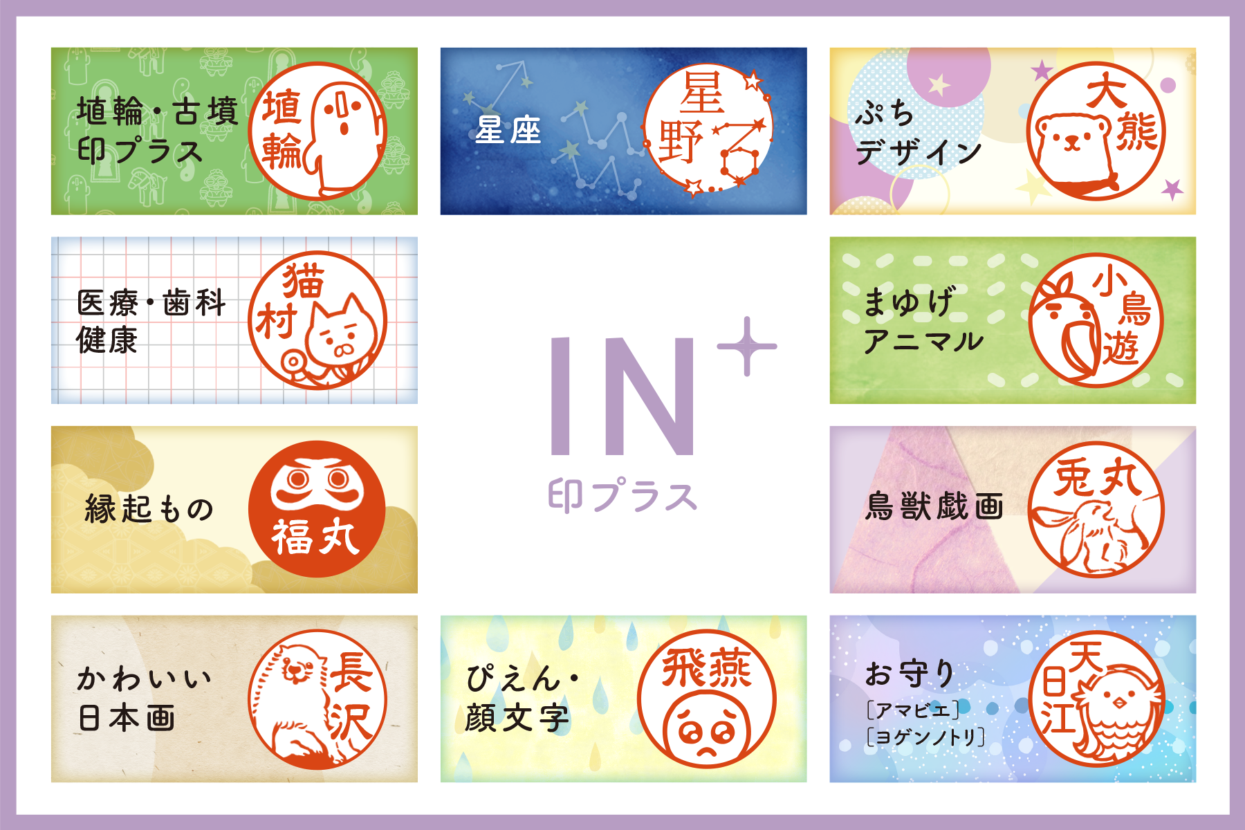 2019年にリリースされた、当店オリジナルのイラスト入り印鑑「印プラス」。古墳・埴輪、縁起もの、鳥獣戯画、まゆげアニマル、星座、顔文字、医療・歯科、かわいい日本画の、全10シリーズを展開しています。