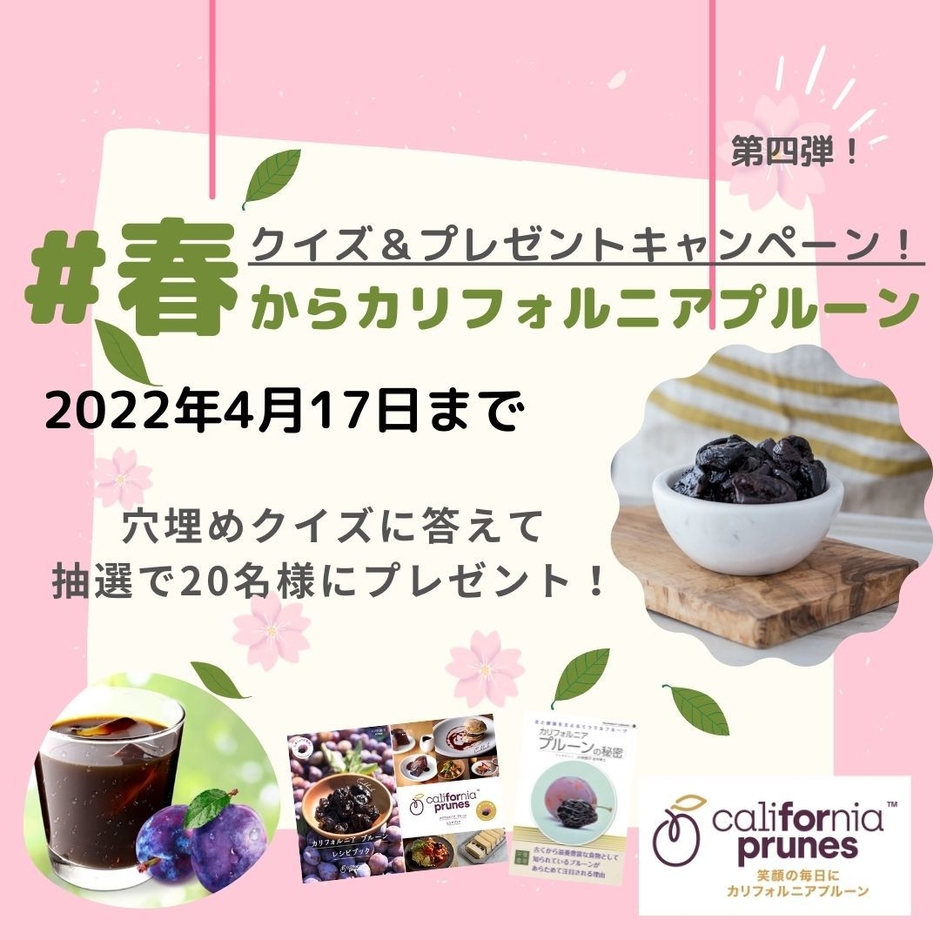 カリフォルニア プルーン協会 日本事務所(本部:カリフォルニア州ローズビル/日本事務所:東京都港区)は、春から新生活が始まる又は健康や食習慣を見直したい方を応援!カリフォルニア プルーンの栄養や健康効果についてのクイズに答えて賞品が当たるキャンペーン第4弾を、2022年4月1日より実施します。