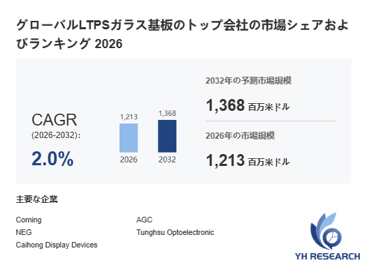 YHResearch調査チームの最新レポート「グローバルLTPSガラス基板のトップ会社の市場シェアおよびランキング 2026」によると、世界のLTPSガラス基板市場は2025年に1190百万米ドル規模に達すると予測され、2026年には1213百万米ドルに拡大する見込みです。2032年までに1368百万ドルに達すると予測されており、2026年から2032年までの期間における年平均成長率(CAGR)は2.0%と予想されています。