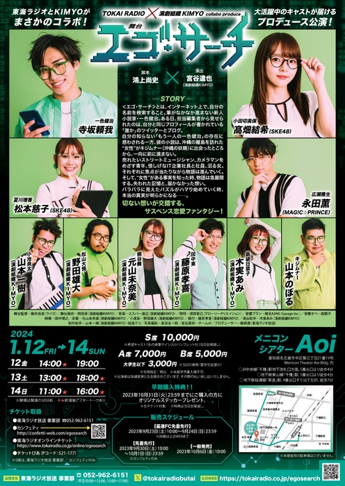TOKAI RADIO ✕ 演劇組織KIMYO collabo produce 舞台『エゴ・サーチ』が2024年1月12日(金)~14日(日)にメニコン シアターAoi(愛知県名古屋市中区葵三丁目21番19号)にて上演されます。チケットはカンフェティにて9月30日(土)10:00~10月1日(日)23:59まで先着先行販売となります。