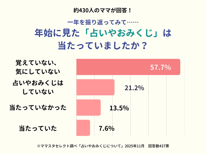 ママスタセレクトでは、「年始に見た『占いやおみくじ』は当たっていましたか?」をテーマにアンケート調査を実施しました。選択肢には「当たっていた」「当たっていなかった」「覚えていない、気にしていない」「占いやおみくじはしていない」の4つを設定。437名のママから回答が寄せられました。