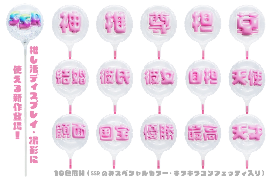 中でも、ソーシャルゲームやカードゲームで最高ランクのレアリティのキャラやアイテムを示す際に使用される「SSR」(Super Special Rareの略)は、キラキラコンフェッティ入りのスペシャル仕様でお届け。想いやワクワクをそのまま形にするバルーンとなっております。
