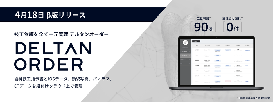 Deltan株式会社(本社:東京都品川区、代表:井上 佳洋)は、日本初*の機能を実装したデジタル歯科技工指示書サービス「DELTAN ORDER(デルタン オーダー)」のβ版リリースを2023年4月18日から開始いたします。