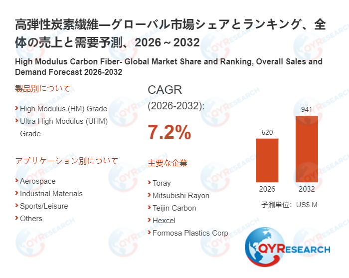 QYResearchが発表した新たな市場調査レポート「高弾性炭素繊維―グローバル市場シェアとランキング、全体の売上と需要予測、2026~2032」によると、世界の高弾性炭素繊維市場規模は2025年の約583百万米ドルから2026年の620百万米ドルへと順調に拡大すると見込まれ、予測期間中は年平均成長率(CAGR)7.2%で成長し、2032年には941百万米ドルに達すると予測されている。