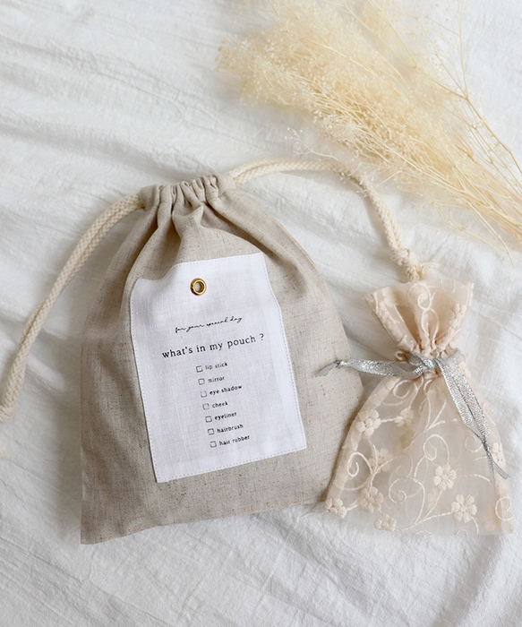 もうひとつはシアーレースのミニポーチ。見失いがちな小さなアイテムを入れるのにぴったりで、ポーチインポーチとしても使い勝手がよいのが特徴です。やわらかなベージュカラーにシルバーラメの細紐のアクセントでかわいさを更にプラスしました。
