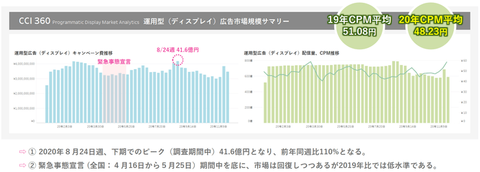 3. 運用型ディスプレイ広告市場では配信量が上期と比較すると減少。キャンペーン費用全体は2019年水準に戻るが、2020年の平均CPMは48.23円(11月末時点)と、2019年の平均CPM 51.08円の水準には戻っていない。
