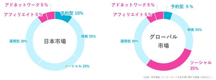 キャンペーン費用の配分では、グローバルでは日本市場に比べ予約型の割合が少なく、その分ソーシャルの比重が大きい。