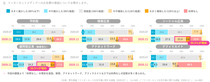 ソーシャル広告(30.3%)、運用型広告(36.0%)でキャンペーン費が増加したと回答し、両取引が市場を牽引。予約型については36.2%が減少したと回答。