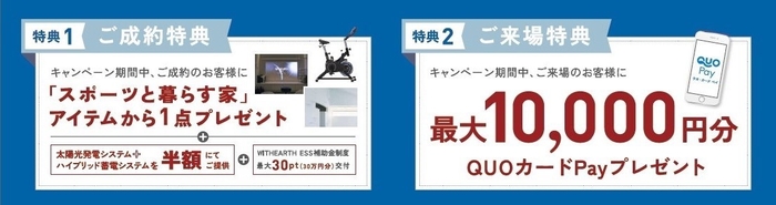 今回のキャンペーンでは、期間中にご成約いただくと、「スポーツと暮らす家」アイテムの中から、もれなく1点をプレゼントいたします。加えて、太陽光発電システムとハイブリッド蓄電システムを半額にてご提供。さらに、太陽光発電システムとハイブリッド蓄電システムをセットで導入したお客様にはウィザースホーム独自の補助金制度「WITHEARTH ESS補助金」が適用され、最大30ポイント(30万円分)を補助金として交付いたします。また、キャンペーン期間中にご来場いただくと、住まいづくりのステージに合わせて最大1万円分のQUOカードPayを進呈。こだわりのマイホームを建てたい人たちを応援するご来場特典もご用意しています。