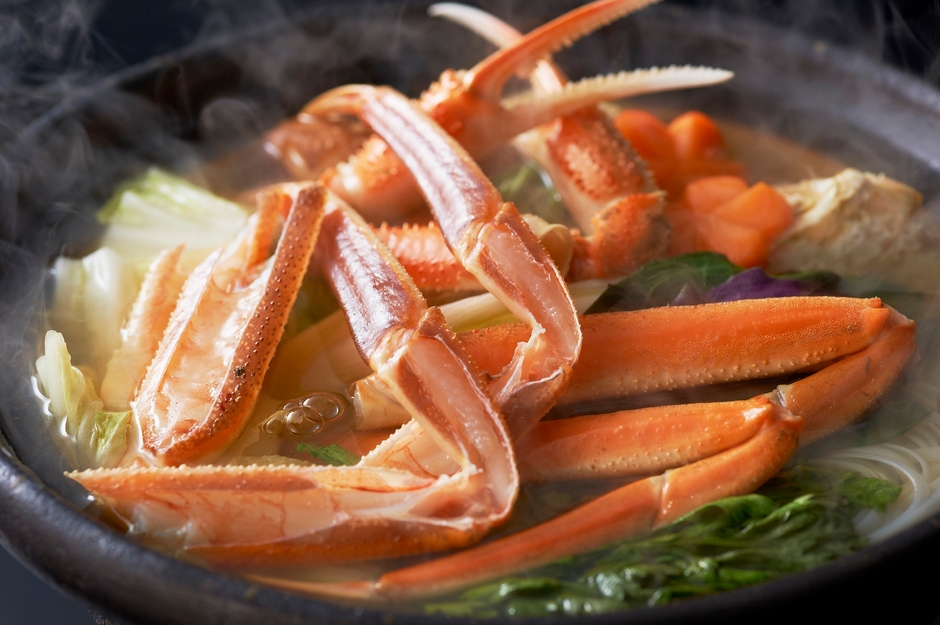 この秋より、特別会席には、「山陰の冬の味覚の王様」といわれ、見た目や身入りの状態を確認する厳しい品質管理をクリアした「タグ付き活松葉蟹」を堪能できる「蟹すき鍋」を提供します。身は濃厚な旨みと上品な甘みがあり、繊維が柔らかく、プルプルした触感が特徴です。〆の雑炊まで、松葉蟹を味わい尽くせます。出汁には宍道湖の名産「シジミ」を使い、鍋は石見地方で作られる石州瓦(せきしゅうがわら)でできた特注品を使い、器からも地域らしさを感じることができます。