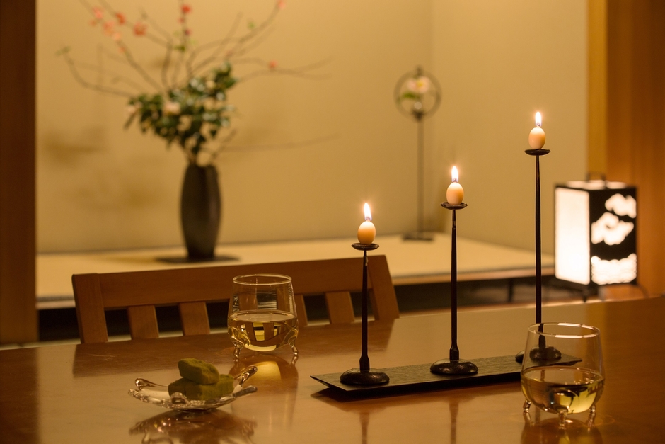 5人の若手工芸作家からなる「シマネRプロダクト」とコラボして作った「出雲匠の間」。出雲鍛造、石州和紙、組子細工など、伝統の技と新しい感性が光る作品の数々が室内を彩ります。あたたかさを演出するのは、ユネスコ無形文化遺産にも登録されている石州和紙で作られた襖と障子。そこに何種類もの細かな木片を組み上げて模様を描く組子細工の天井照明と、出雲鍛造で造られた情緒あふれる燭台や行灯が、優しい光を放ちます。