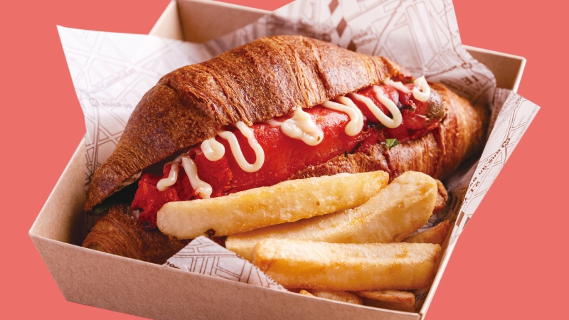 バターたっぷりサクサクのクロワッサンに、焼き明太子を挟んだホットドッグの明太子版。焼き明太子の香ばしさと濃厚な味わい、一緒に挟んだ大葉の爽やかな風味、まろやかなマヨネーズの相性も◎。
