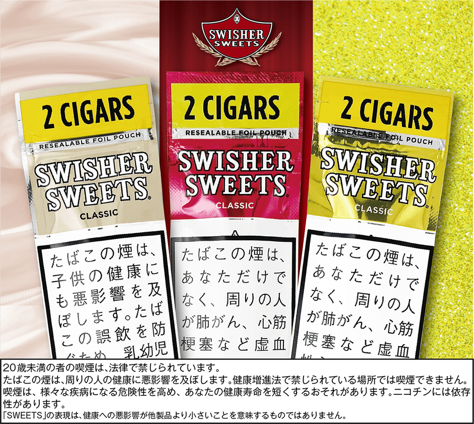 スウィッシャースイートフォイルパウチは、アメリカ合衆国のスウィッシャー社が製造、インターコンチネンタル商事が輸入販売を行っているシガリロ(機械巻きの葉巻たばこ)です。気軽に試せる2本入りでお求めやすい価格の「スウィッシャースイートフォイルパウチ」シリーズは、2013年の発売以来多くのお客様にご好評いただいております。この度、より多くのお客様のニーズにお応えしたいという想いから、3種の新フレーバー「クリーム」、「ワイルドラッシュ」、「バナナスマッシュ」を発売する運びとなりました。