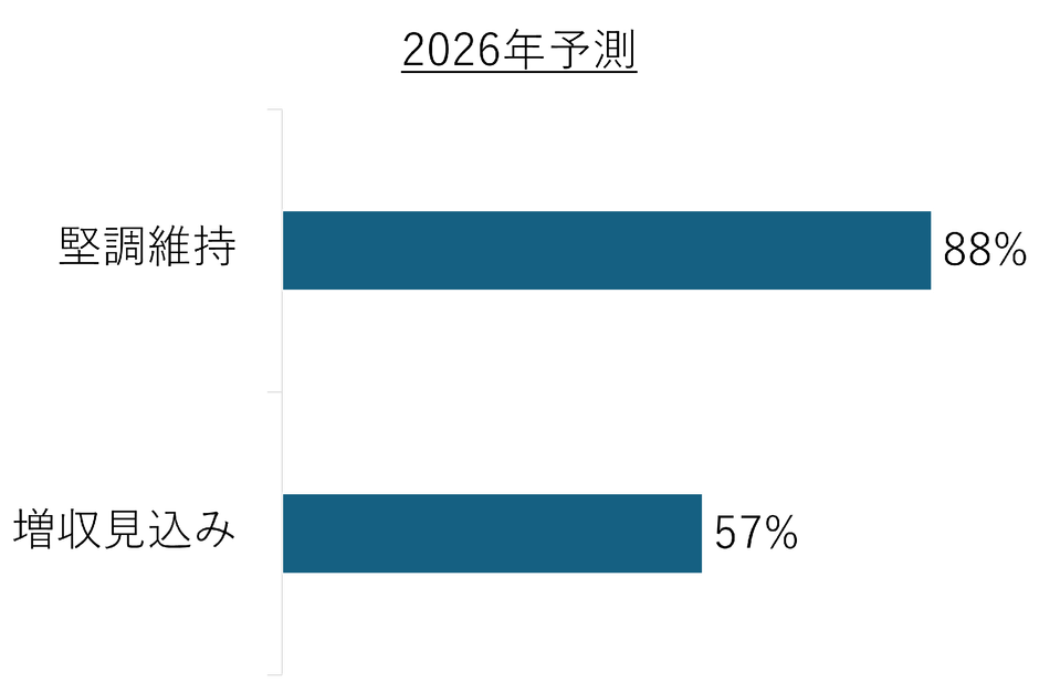 2026年は増収見込みや堅調維持などポジティブな傾向が見られる一方、コスト高騰や人手不足は全業態において依然として課題であることが伺えます。