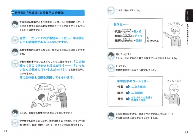 「わかりやすく教えること」を得意とする東大教授・西成活裕先生と、数学が苦手な文系ライター・郷 和貴氏の2人が本作でもタッグを組み、面白おかしく会話しながら“高校数学の本質”を解き明かします。