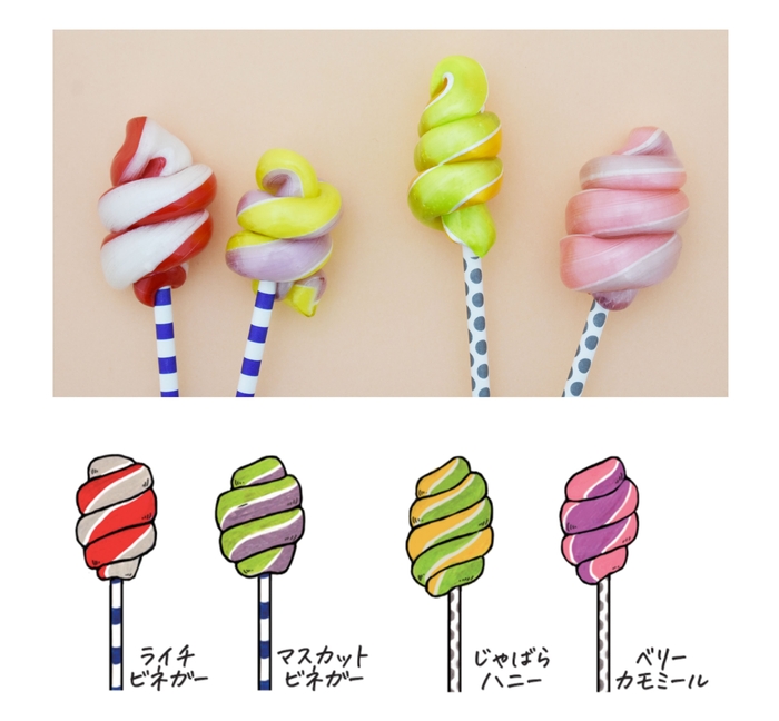 より紅茶やドリンクに溶かして楽しめるよう、人気のペティキャンディをマドラー型に仕上げた「フレーバーマドラー」。のど飴ミックスから「ベリーカモミール」「じゃばらハニー」、ビネガーミックスから「ライチビネガー」「マスカットビネガー」が紅茶に混ぜやすいマドラータイプになりました。ゆっくり溶かしながら味の変化をお楽しみください。