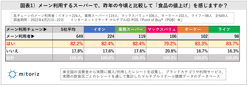 まずはアンケートで、各チェーンのメーン利用者に「昨年の今頃と比較して食品の値上げ」を感じるか尋ねると、5社平均値で8割以上の人が「値上げを感じる」(82.2%)と回答しチェーン問わず、店頭価格に大きく影響していることがわかりました。