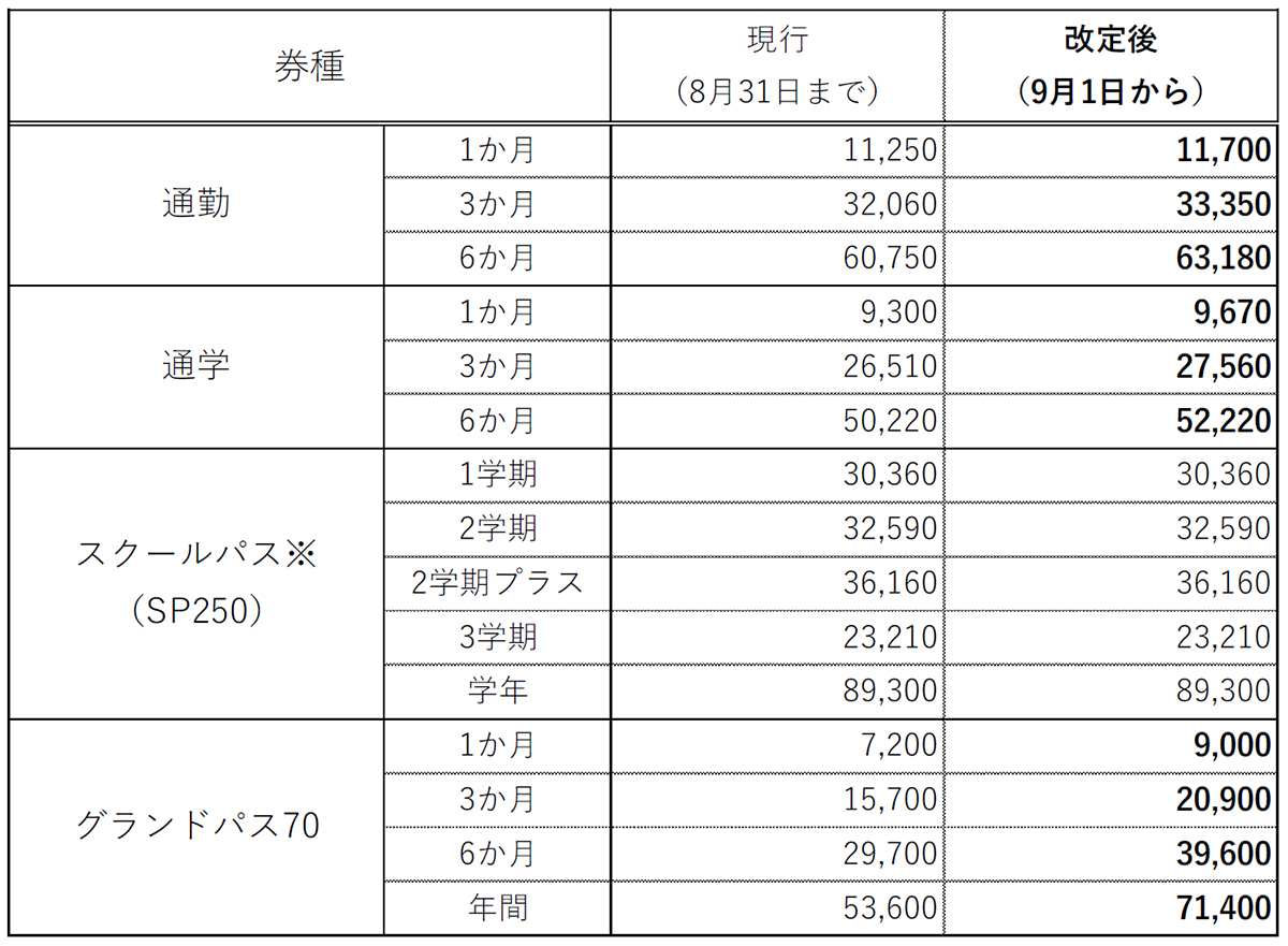 ※スクールパス(SP250)は、現行の価格で当社260円区間の乗車が可能です。