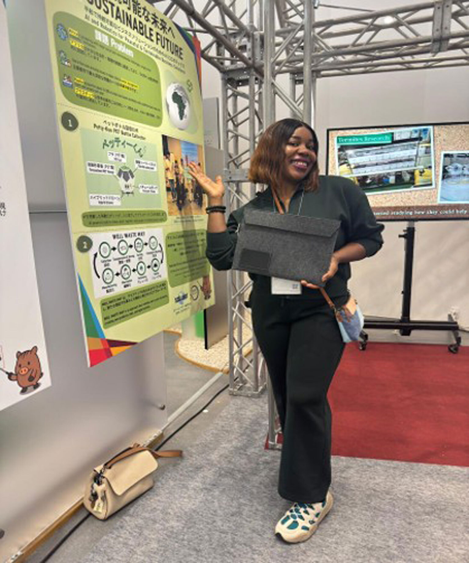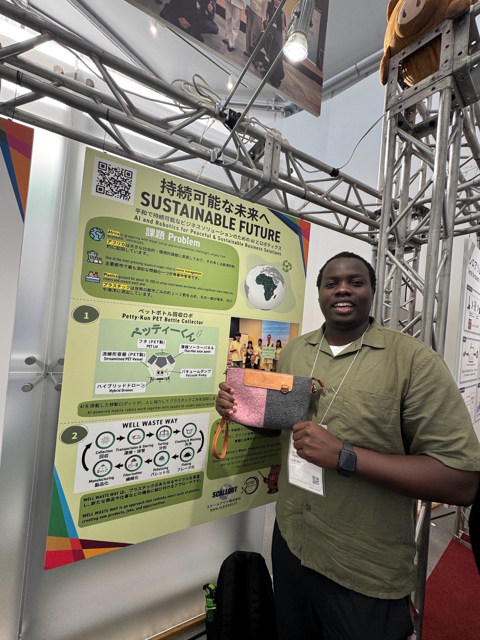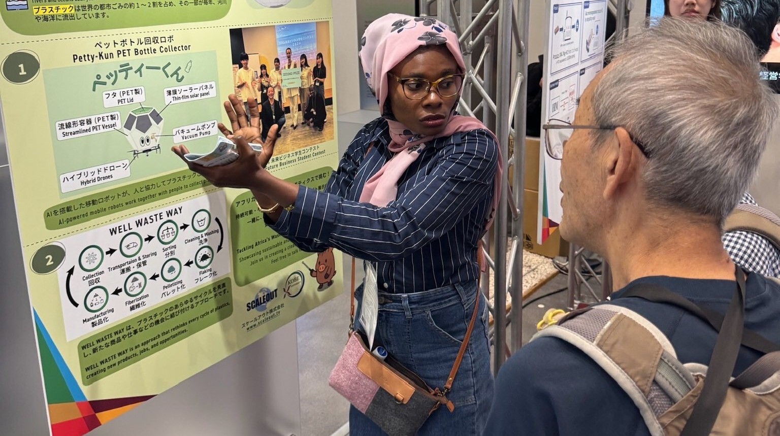 展示内には、スケールアウトが企業課題として提示したナイジェリアのごみ処理問題を扱うため、大手前大学・共立女子大学の学生により提案され、2024年の上記コンテストで準優勝に輝いた「ペッティーくん (Petty-kun)」コンセプトや、ガーナのごみ処理問題からの着想によりリサイクルを包括的に見直す “WELL WASTE WAY”、そのプロセスとして「ペットボトルからできているカバン」(小島産業株式会社さまの製品「Felle」)を例示しました。