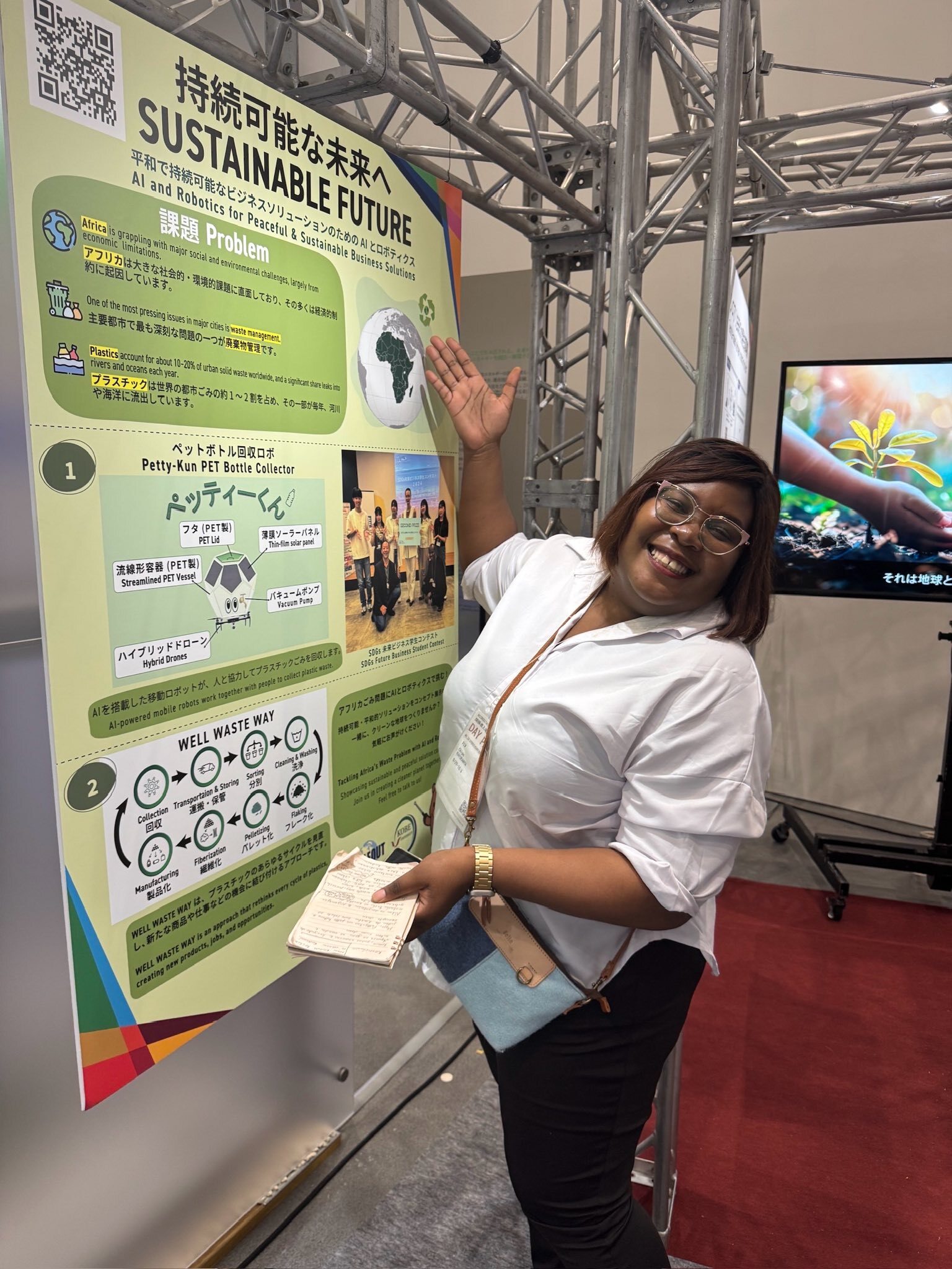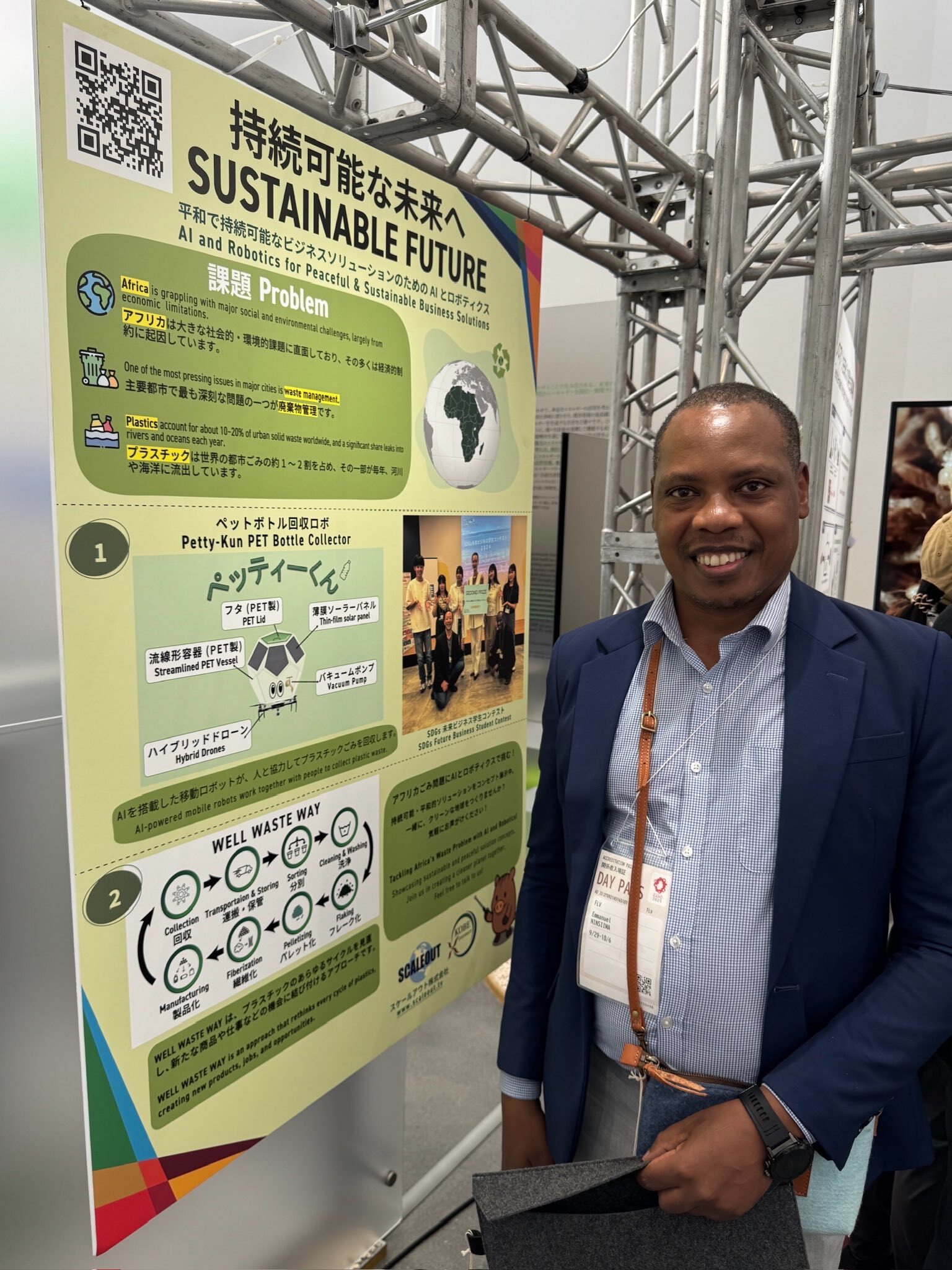 説明員をしたインターン生の声「フューチャーライフヴィレッジ・パビリオンでの時間を本当に楽しみました。 プラスチックごみの回収やリサイクル促進に関する取り組みを発表したり、ペットボトルからできたバッグを紹介する機会を得て、来場者や他の出展者の方々と有意義な議論を交わすことができました。」(Fathia Jombi Khei)