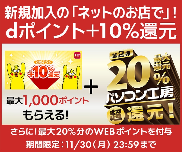 パソコン工房WEB通販サイトにて、新規加入の「ネットのお店」で! dポイント+10%還元キャンペーン開催! 期間限定11/30(月)23:59まで