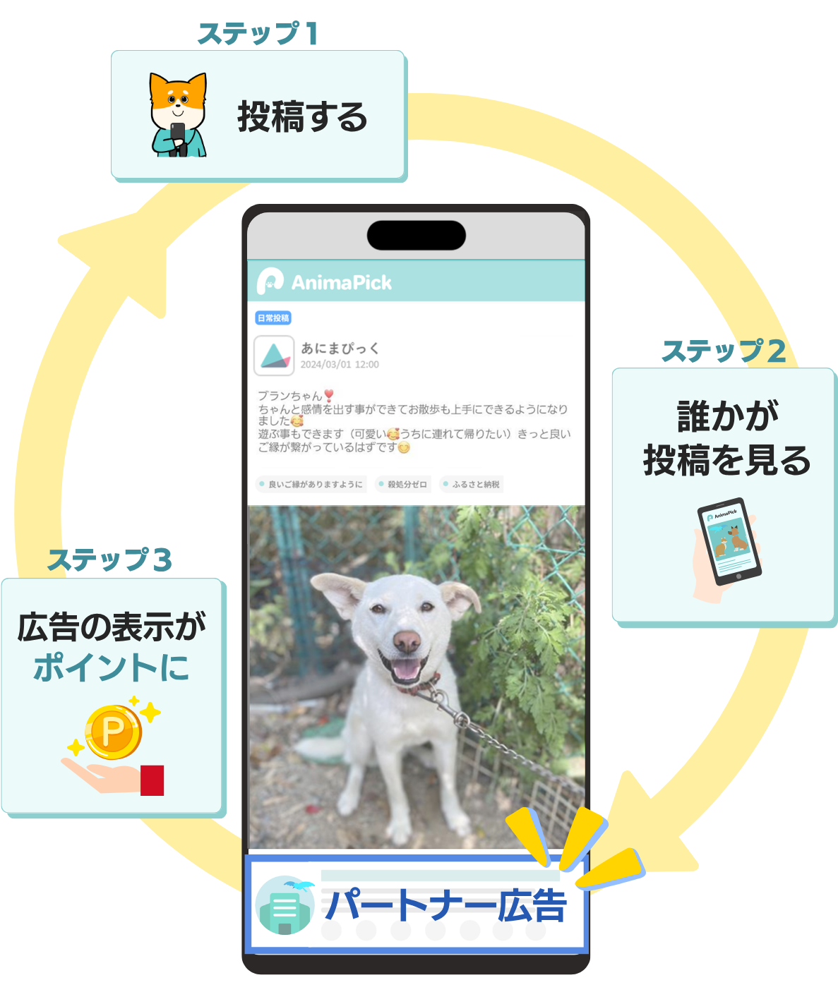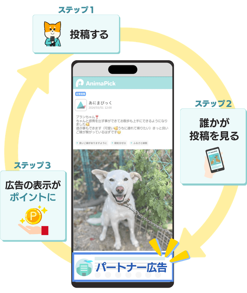 ユーザーはペットとの日常を投稿することでポイントが貯まり、そのポイントを通じて、保護犬猫をはじめ、さまざまな保護動物の支援に手軽に参加することができます。