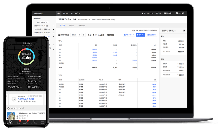 「WealthPark」は、不動産賃貸管理の収支などがスマホアプリやWebサイトで確認できる不動産オーナー向けの資産管理ツールです。