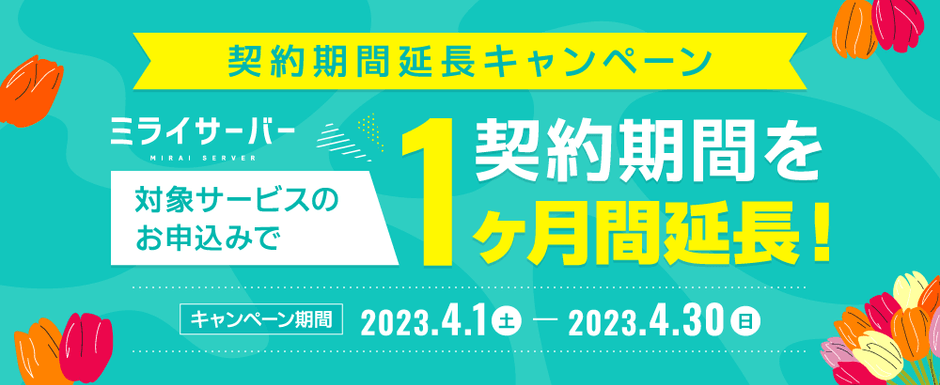 ミライサーバー(運営会社:アシストアップ株式会社、所在地:大阪府大阪市、代表取締役:青木 勝彦)は、2023年4月1日(土)~4月30日(日)の期間、契約期間延長キャンペーンを実施いたします。