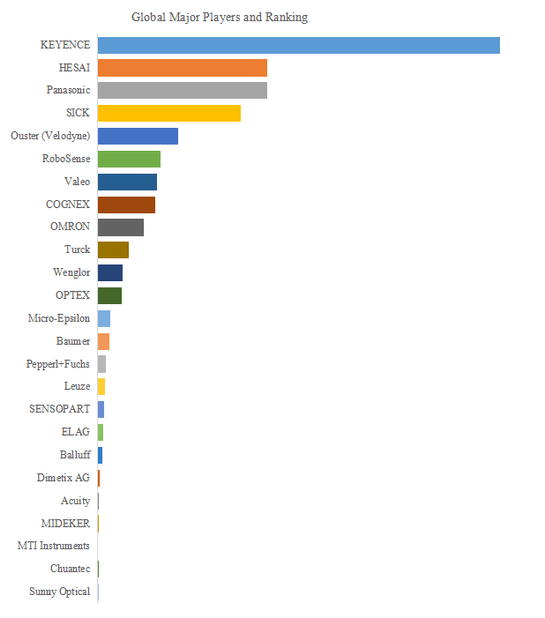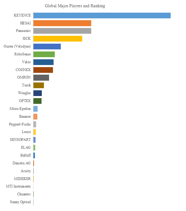 レーザー測距センサー市場は、技術力とブランド信頼性を武器とするグローバル企業によって寡占化が進んでいる。LP Informationのデータによれば、2024年時点での世界トップ10企業(KEYENCE、HESAI、Panasonic、SICK、Ouster (Velodyne)、RoboSense、COGNEX、Valeo、OMRON、Turck)は、売上ベースで約69.0%の市場シェアを占めている。日本企業ではKEYENCE、Panasonic、OMRONなどが高精度・高耐久性の製品で産業用途に強みを持ち、中国勢ではHESAIやRoboSenseがLiDAR応用における技術革新で頭角を現している。また、欧州のSICKやValeo、米国のCOGNEXやVelodyne系統のOusterなども、産業用から車載用まで多用途展開を図っており、競争は技術・用途・地域の三軸で多層化している。