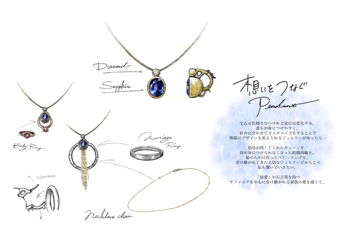 受賞理由:祖母から母、そして娘へと大切なジュエリーを、想い共に過去・現在・未来へと繋いでいくことができるデザインです。「想い」のこもったジュエリーは、どんなハイブランドよりも価値があると言えます。家族愛を感じることができる、まさに世界に1つだけのジュエリーです。