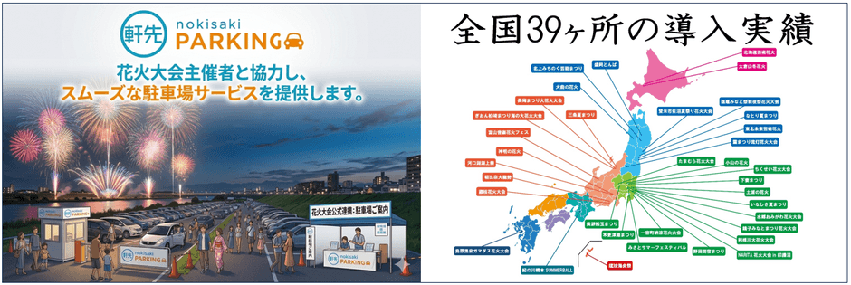 日本国内で開催される花火大会において、予約制シェア駐車場導入数で業界随一の実績を持つ軒先株式会社(本社:東京都港区、代表取締役:西浦明子、以下 軒先)は、2025年度において、全国39カ所の花火大会・まつり会場周辺での駐車場予約・送客支援を行った結果、総送客数は延べ12.5万人を記録し、地域への経済波及効果は推定約8.6億円に達しました。
