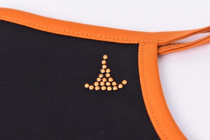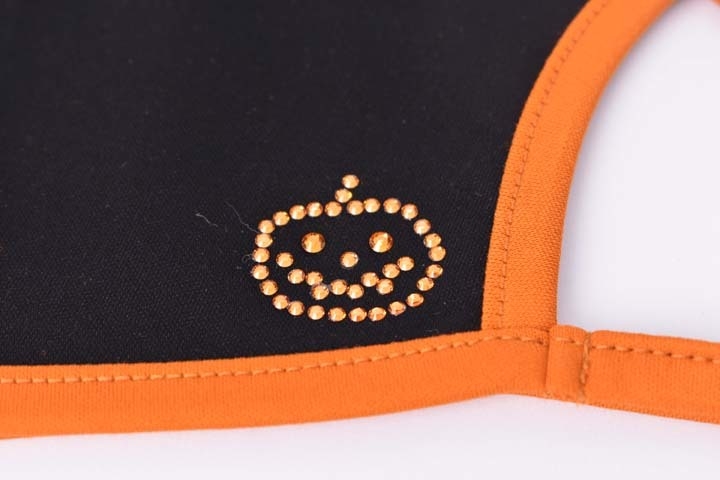 ハロウィンカラーのオレンジとブラックのバイカラーで仕上げた特別仕様のマスクに、ハロウィンカラーのラインストーンでデコレーション。