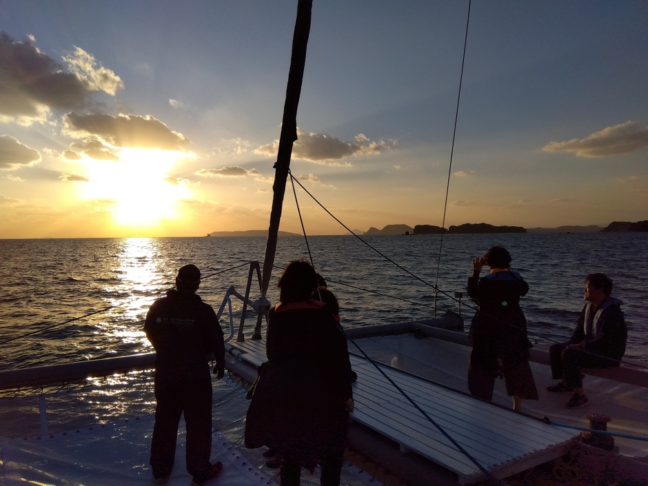世界で最も美しい湾に認定された九十九島の風景に夕日が溶け込んで空と海の境界線が青色→オレンジ色→紫色と分刻みで色のグラデーションが移り変わっていく景色は必見です。一般的なクルーズと違い双胴船で帆を立てて移動する際は、波のさざ波が心地よいサウンドになって感動を際立たせます。