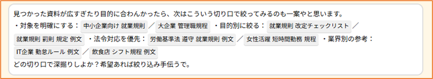 AIが聞き手となり、チャット形式で対話を重ねながら資料の絞り込みをサポートします。AIのキャラクター(方言や語尾など)も柔軟にカスタマイズ可能です。