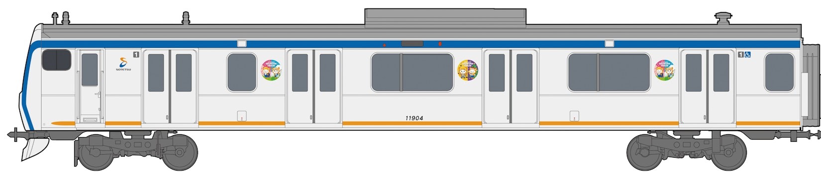 車両側面のラッピング(イメージ)※乗降扉(先頭を除く)の左側にあるイラストがラッピングです。