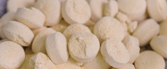 リポビタンDXの配合成分には、タウリンやグリシン、ビタミンCなど、実は錠剤化に向いていない“わがままな成分”がたくさん含まれています。しかしながら、商品としての品質を保つには、輸送中や日常の持ち運び、保管時にも、錠剤が崩れたり割れたりしないように、しっかりとした強度を持たせることが必要不可欠です。