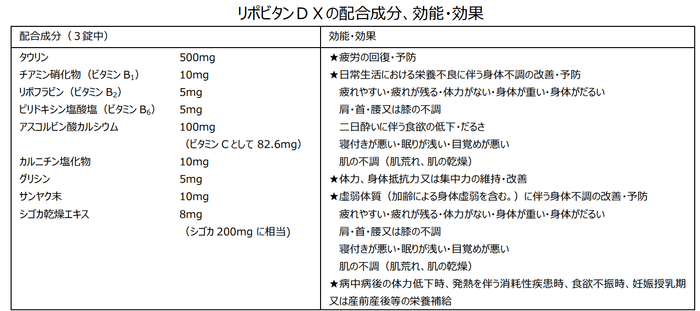 日々の健康や疲労の予防・回復などを意識しビタミン剤を使用する方にとって、日々飲みやすいことはとても大切です。そのためには、錠剤の飲みやすさ、なるべく少ない服用回数、服用錠数の範囲で効果が得られることが重要だと私たちは考えました。リポビタンDXは、タウリン、グリシン、ビタミンCなどの9種類の有効成分を配合し、様々な効能・効果が期待できるビタミン剤です。このように、1日1回、1回3錠という「小さくて飲みやすい」錠剤を実現するためには、実は多くの技術的な課題がありました。